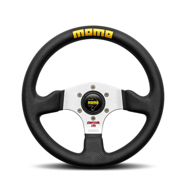 Accueil // Boutique // Divers // Volant Momo Competition Evo Tulipé (42 mm), Cuir Noir, Branches Alu – 32 cm