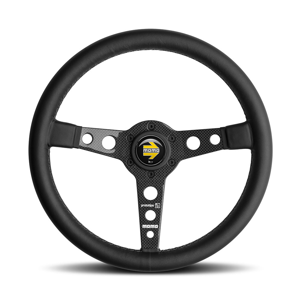 Accueil // Boutique // Divers // Volant Momo Prototipo 6C Tulipé (39 mm), Cuir Noir, Branches Carbone – 35 cm